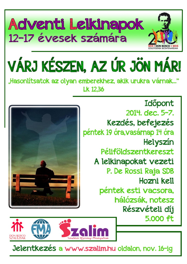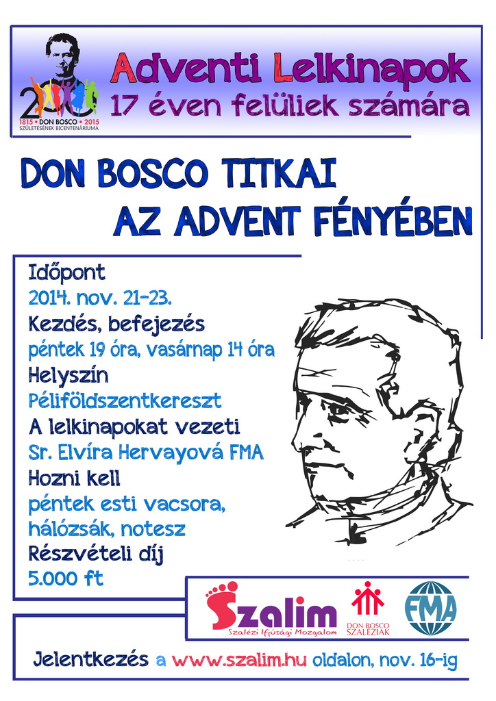 A fiatalok lelkigyakorlata november 21-23. között lesz „Don Bosco titkai az adventi fényében” vezérgondolattal. A lelkigyakorlatot Elvira Hervayová FMA, a Segítő Szűz Mária Leányai egri kollégiumában dolgozó nővér vezeti. Jelentkezni lehet november 16-ig a www.szalim.hu oldalon.